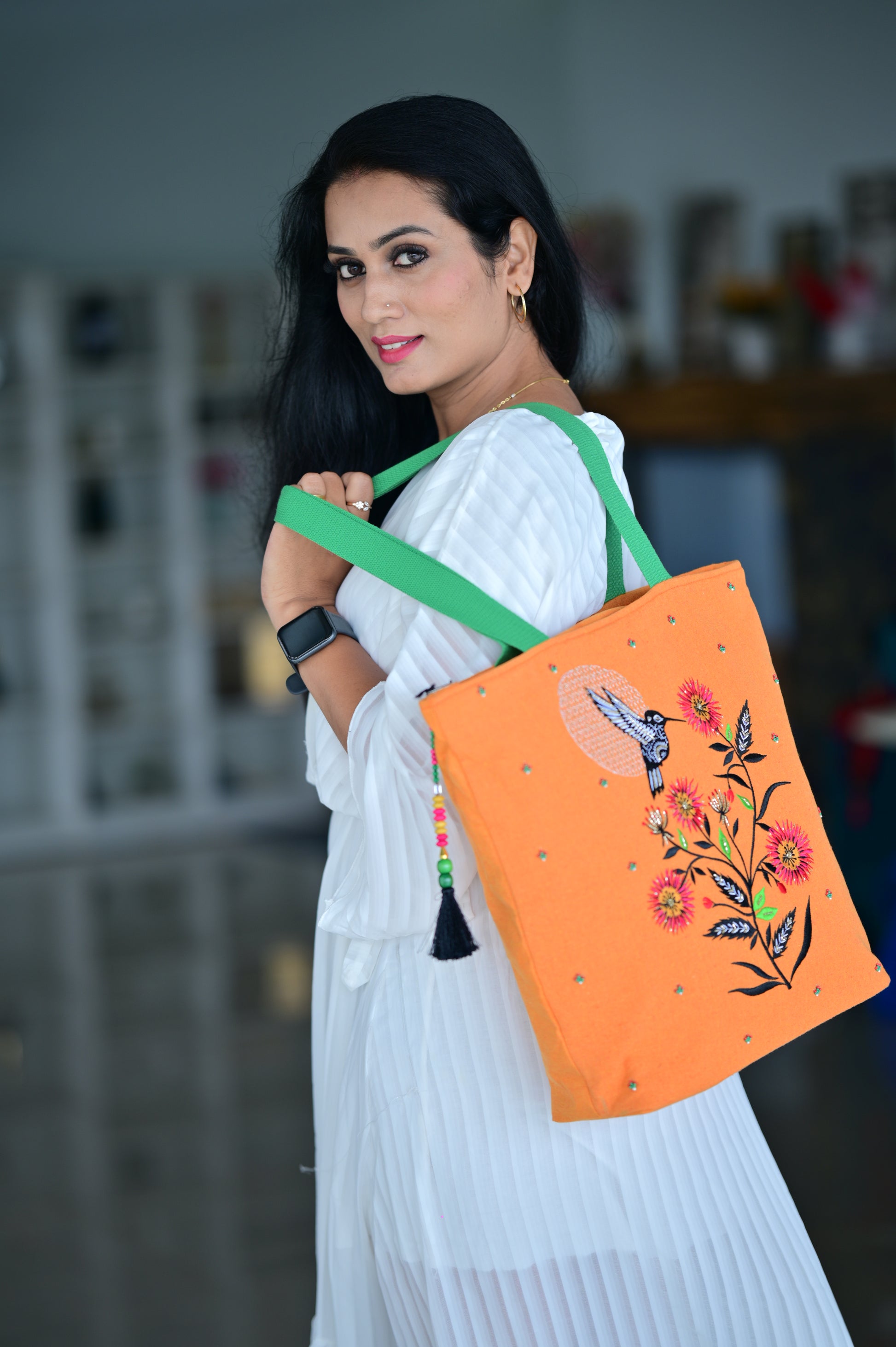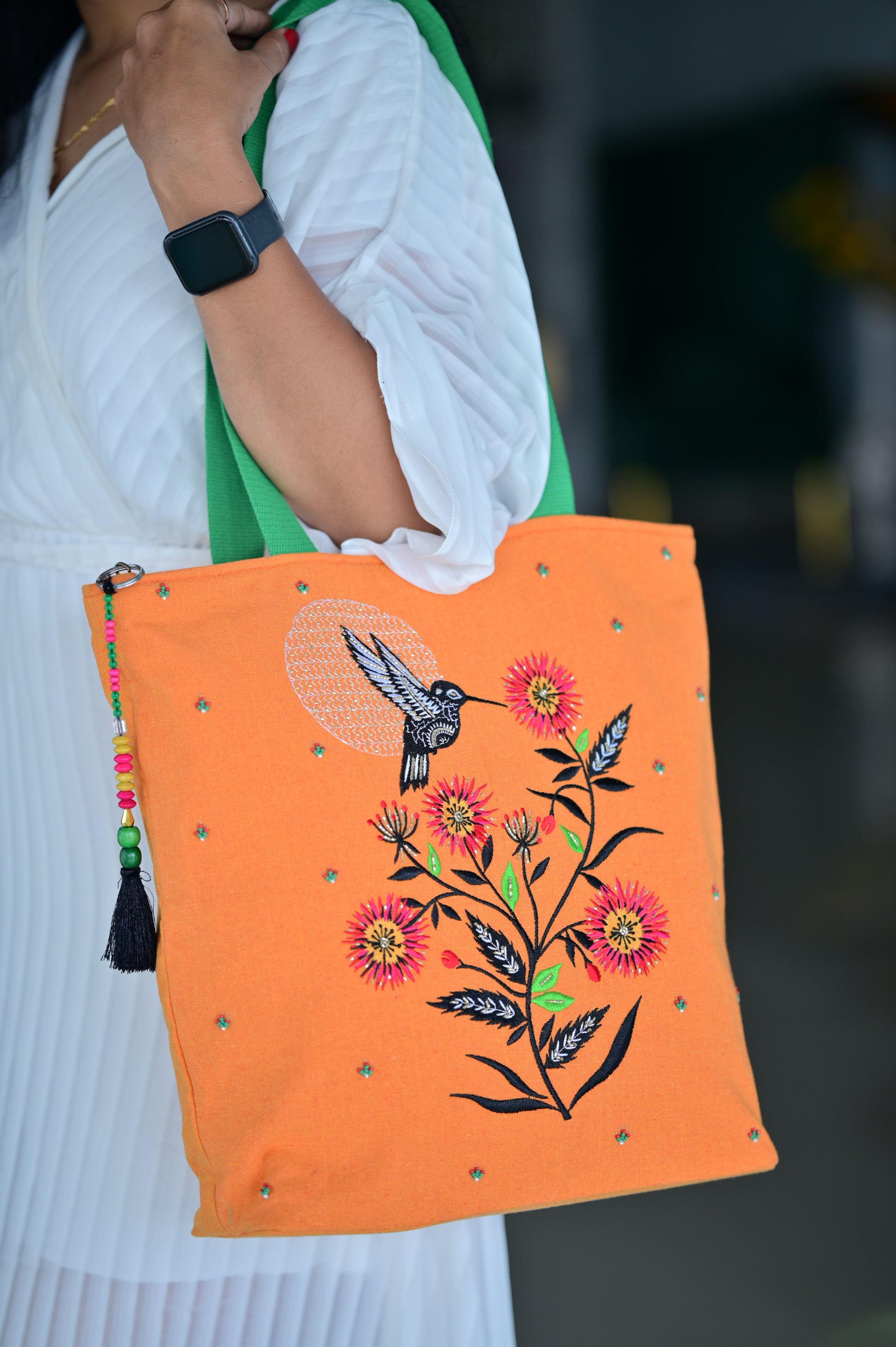A vibrant handloom tote inspired by the fiery gulmohar bloom and free-flying birds. Stylish, sturdy, and soulful — where art meets everyday ease.