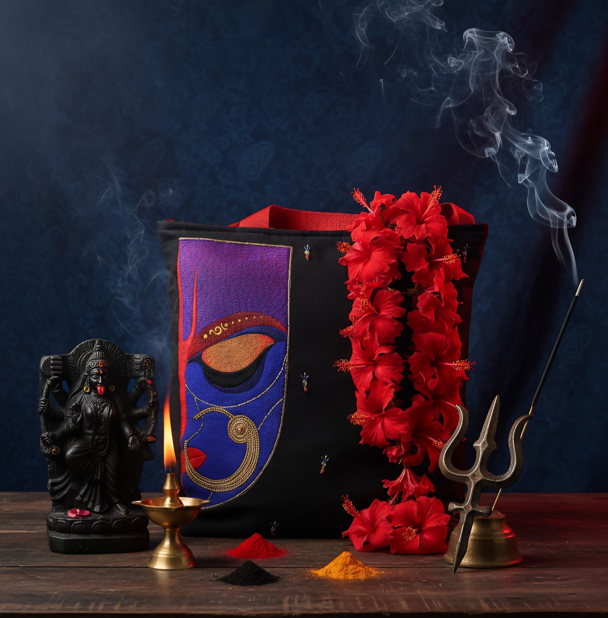 Inspired by the divine energy of Mahakali, this tote features intricate machine and hand embroidery. Spacious and stylish, it blends devotion with everyday utility.