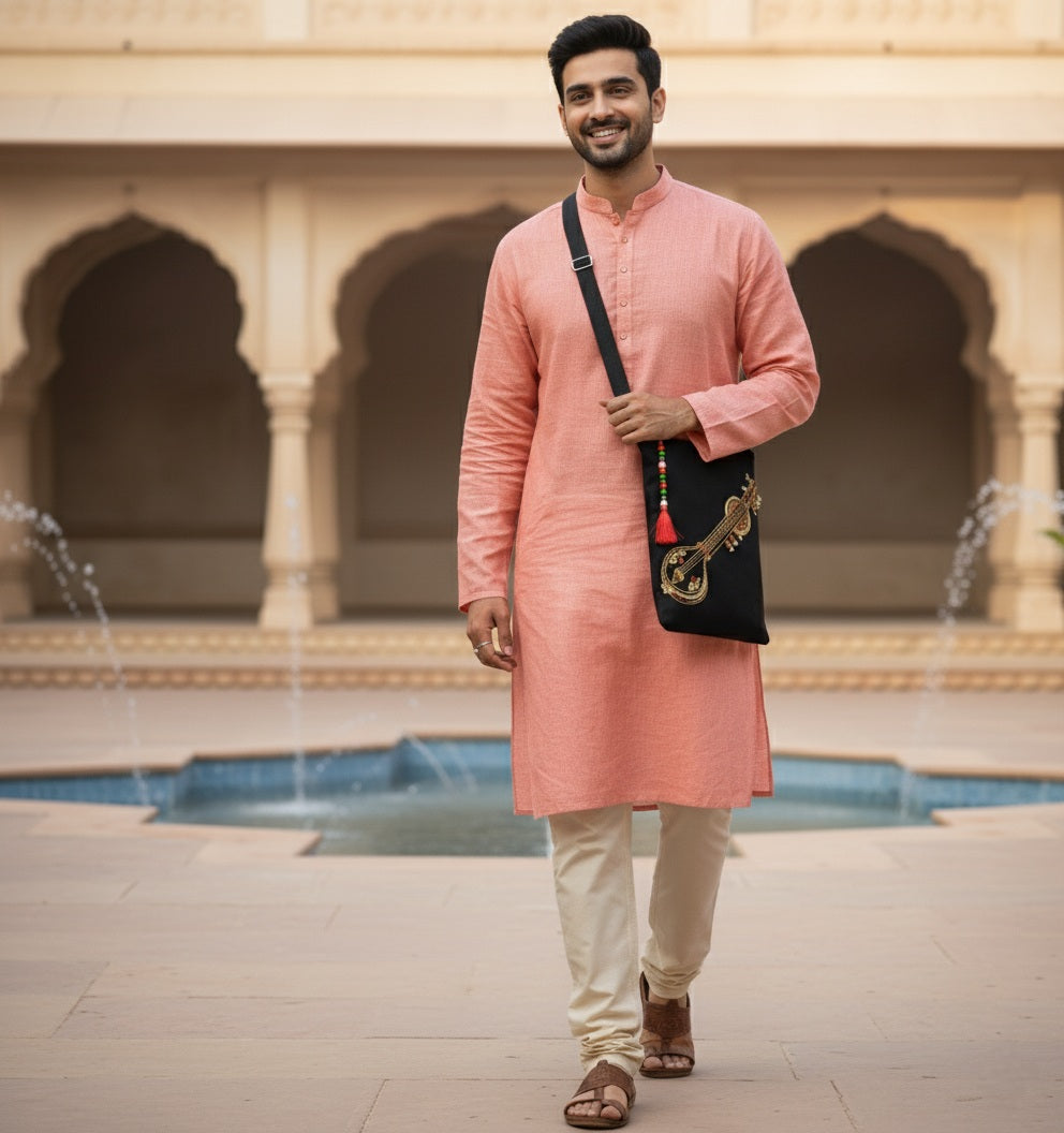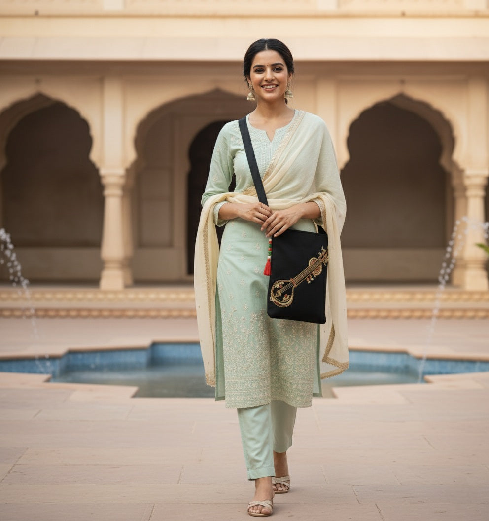 Celebrate Indian classical heritage with this versatile unisex sling, featuring a Veena-inspired print enhanced with delicate hand embroidery. Spacious yet stylish, it blends tradition with modern utility—perfect for everyday carry with a touch of culture.